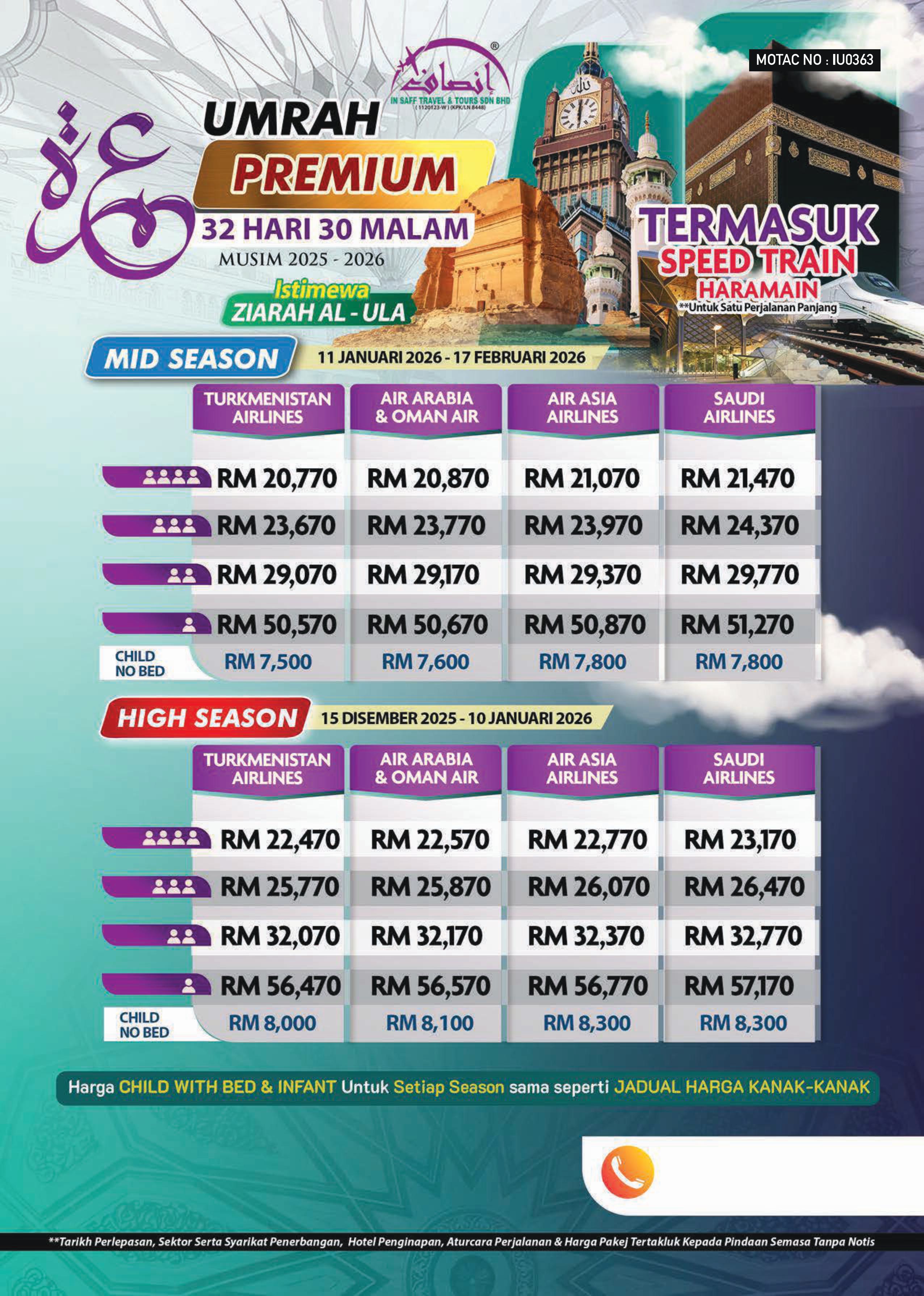 Lengkapkan ibadah anda dengan Pakej Umrah 32 Hari 30 Malam Super Eko, bermula dari hanya RM7,970. Dengan penginapan selesa di Makkah (19 malam), Madinah (10 malam), dan Taif (1 malam), pakej ini turut menawarkan pengalaman istimewa seperti ziarah ke Al Ula dan lokasi perang Badar, menjadikan perjalanan anda lebih bermakna.