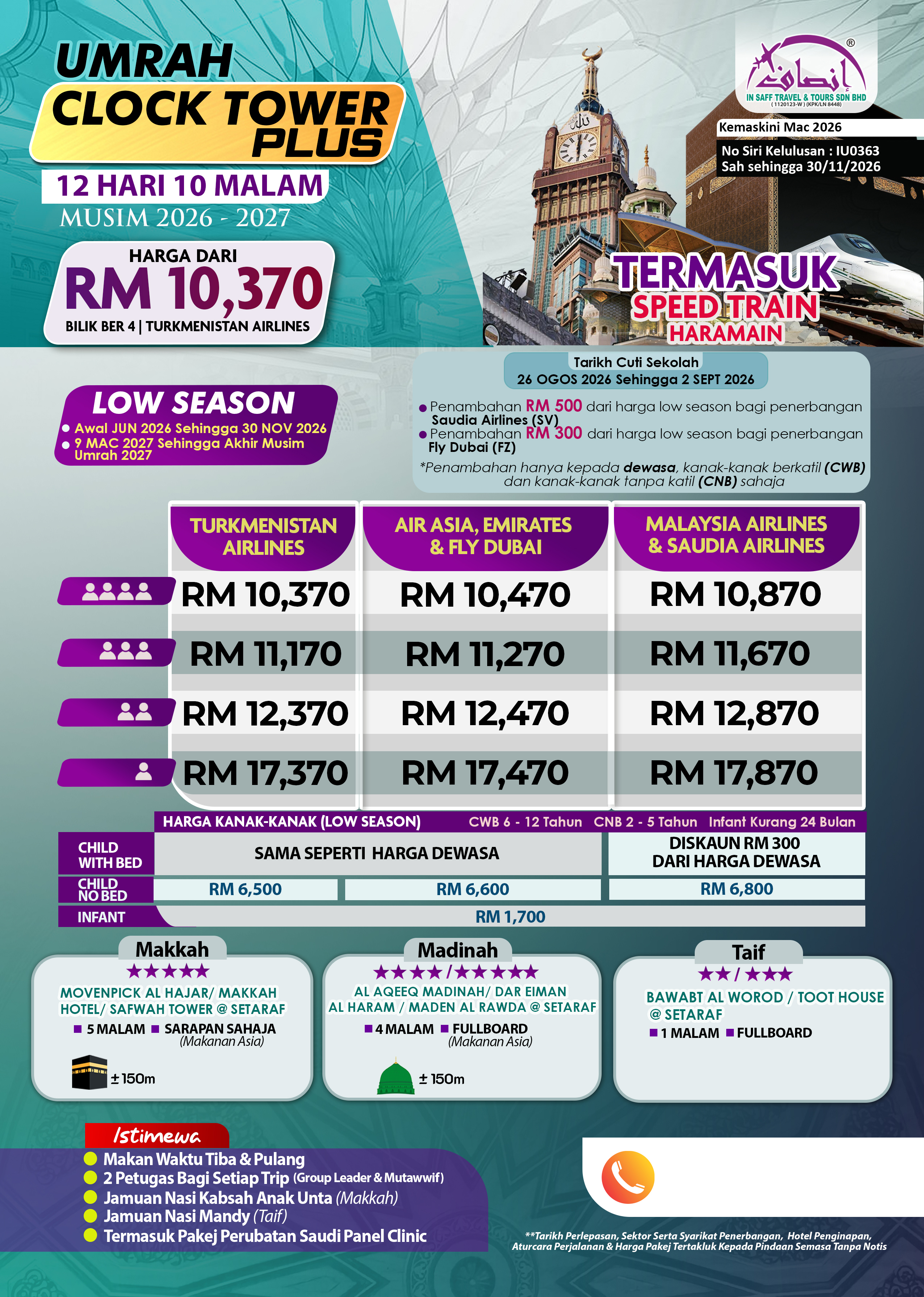 Nikmati pengalaman umrah yang lebih panjang dan mendalam dengan Pakej 12 Hari 10 Malam kami. Direka untuk memberikan anda masa yang mencukupi untuk memperbanyakkan ibadah, menjelajahi tempat-tempat bersejarah, dan menikmati keselesaan penginapan yang strategik berhampiran Masjidil Haram dan Masjid Nabawi. Pakej ini dilengkapi dengan bimbingan Mutawwif berpengalaman, jadual perjalanan yang tersusun, dan pelbagai kemudahan terbaik.